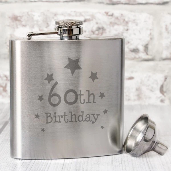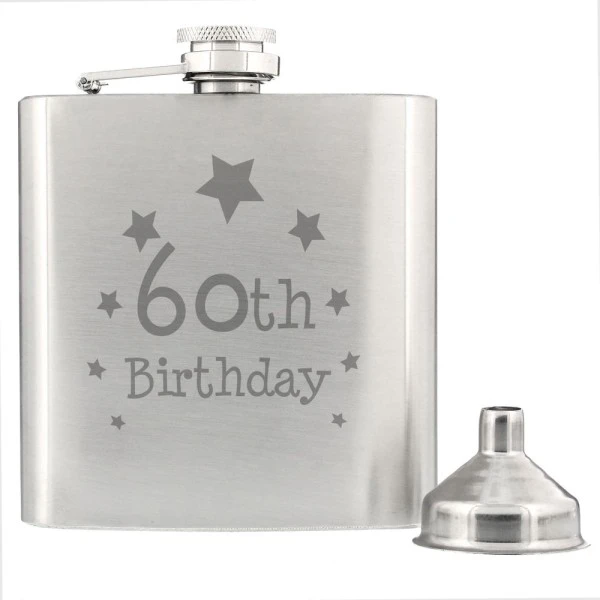 This 6 oz. stainless steel Hip Flask comes with the wording “60th Birthday!” featuring a star motif as standard.