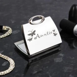This silver finish handbag compact mirror features a butterfly motif and the wording “Auntie” as standard text.