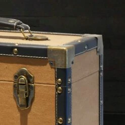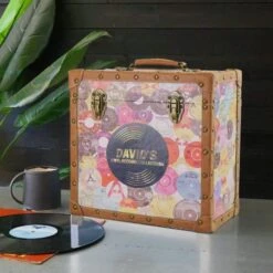 Personalised 12 Inch Record Storage Box – Tan Cloth With Black Leather Trim – Record Sticker