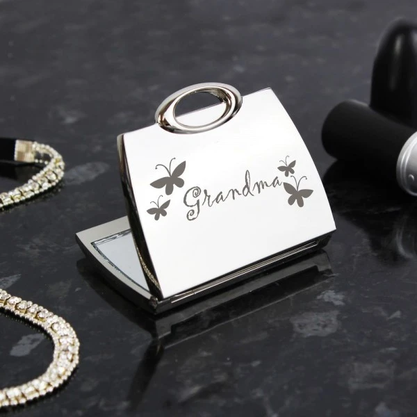 This silver finish handbag compact mirror features a butterfly motif and the wording “Grandma” as standard text.