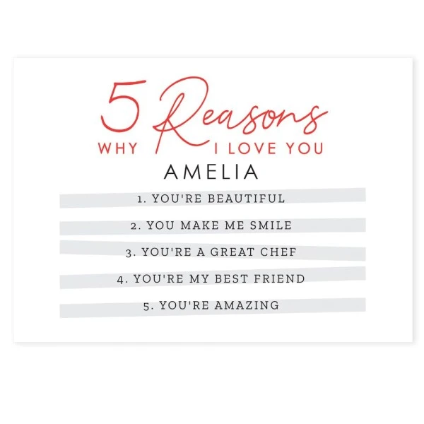 The text “5 Reasons why I love you” to the front is a fixed part of the design. Personalise with your 5 reasons to the front plus your own special message to the inside.