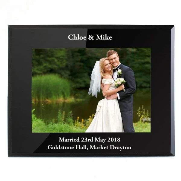 Personalise this Landscape Black Glass Frame with a line above the photo of 25 characters, and two lines below the photo of 30 characters each.
