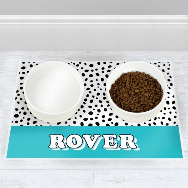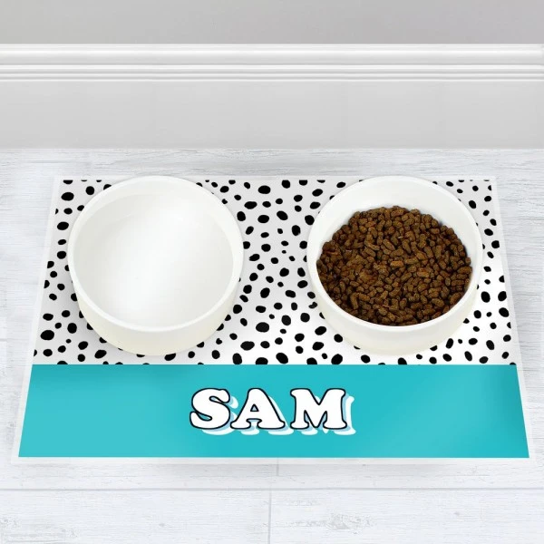 Personalise this blue spot food and water pet placemat with a pets name using up to 12 characters.