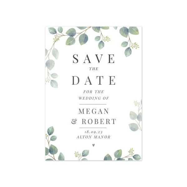 Personalise these 36 x Botanical Save the Date cards with a message over 4 lines as below.