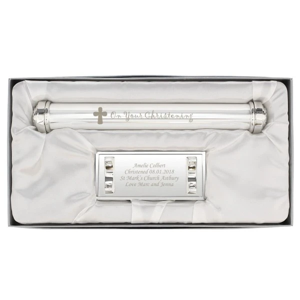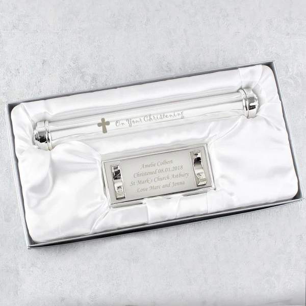 The wording “On Your Christening” featured on the holder is fixed text.