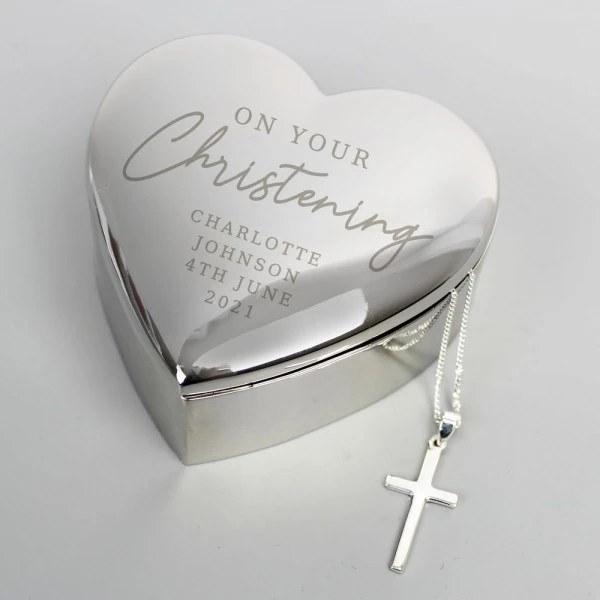 This Personalised Heart Trinket box with Cross Necklace is a perfect gift for their Christening.