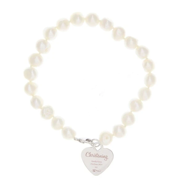 This stunning Personalised Christening Swirls & Hearts White Freshwater Pearl Bracelet is a stylish and unique gift for a Christening.