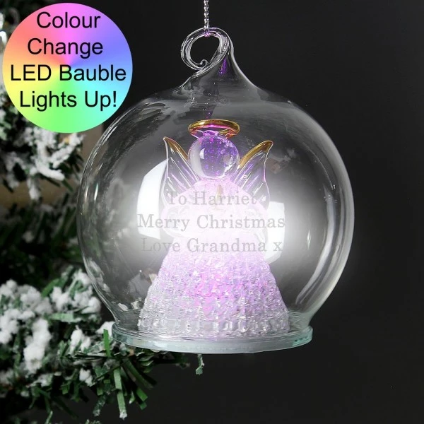 A beautiful personalised glass bauble that features a light up LED Angel inside perfect for adding a splash of colour to your tree or remembering a loved one at this special time of the year.