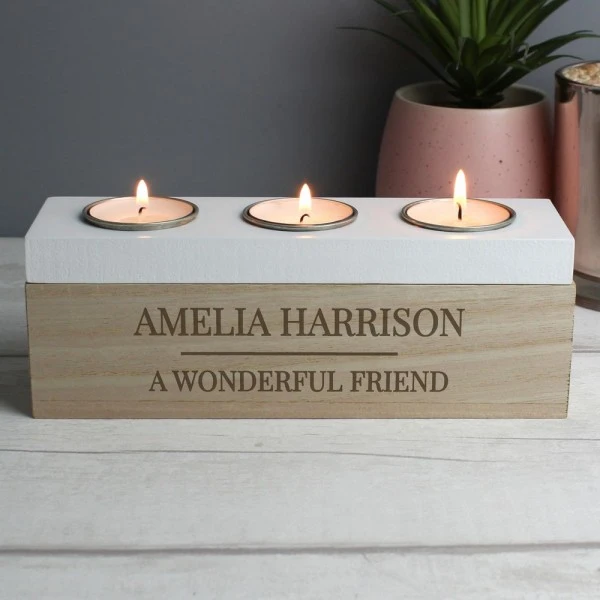 Get your home organised with the help of our Personalised Classic Tea Light Box! This wooden, shabby chic box can store a small amount of tea lights or trinkets. Three tea lights can be displayed on top of the box, creating a unique feature for any shelf or mantelpiece.