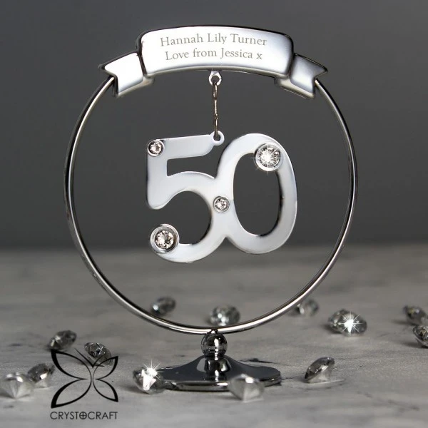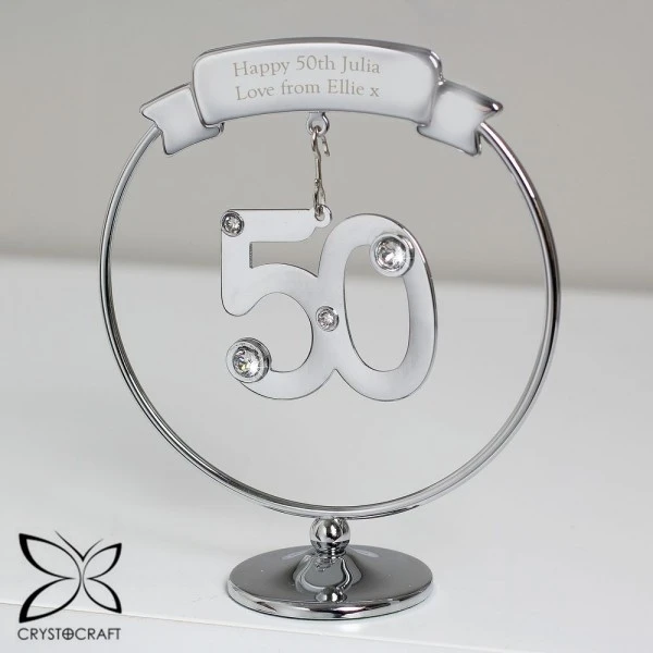 Mark their 50th Birthday or Wedding Anniversary with this elegant Crystocraft ornament. Dangling from a personalised round silver stand is a crystal clad