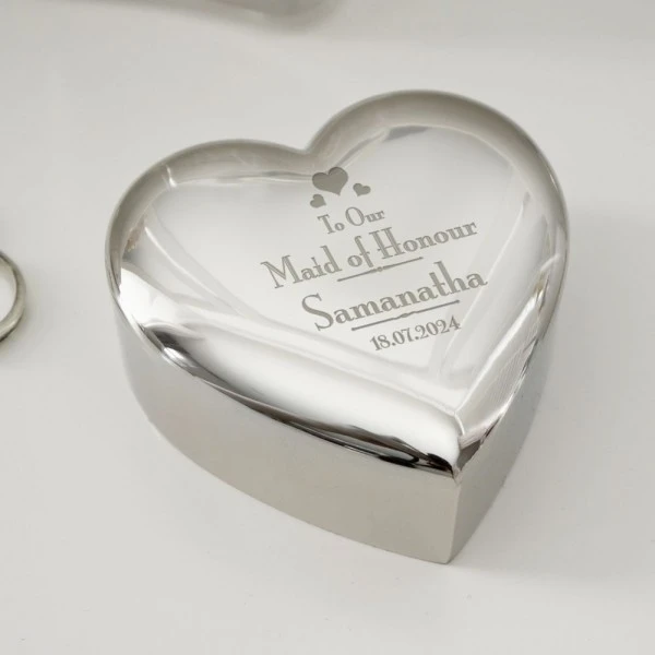 Personalise this Decorative Wedding Maid of Honour Heart Trinket with a name up to 12 characters and a date up to 15 characters.