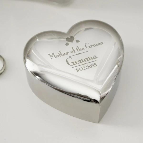 Personalise this Decorative Wedding Mother of the Groom Heart Trinket with a name up to 12 characters and a date up to 15 characters.