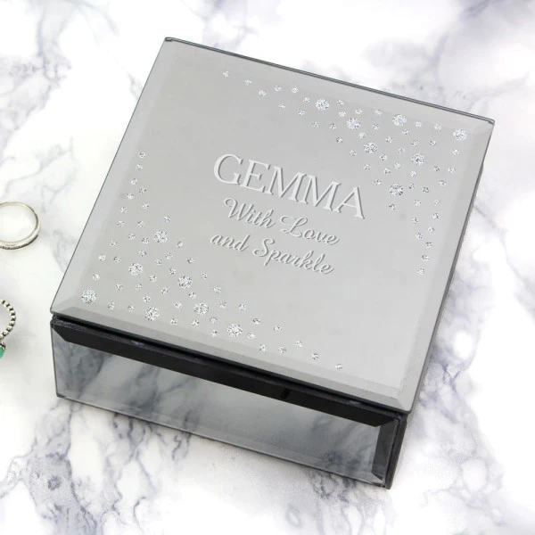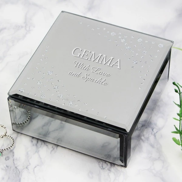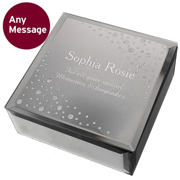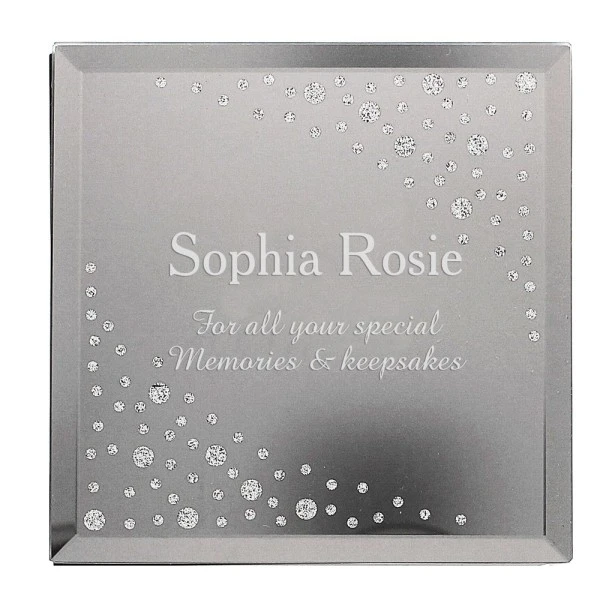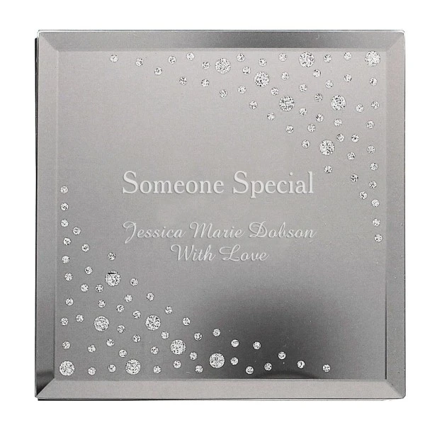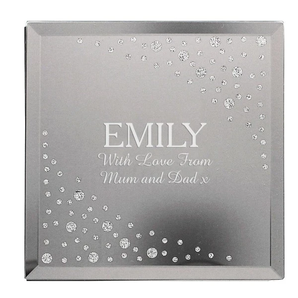 A beautiful diamante effect mirrored Glass Trinket. This item can be personalised with a name of up to 15 characters and any message over 2 lines of up to 20 characters per line. All personalisation is case sensitive and will appear as entered.
