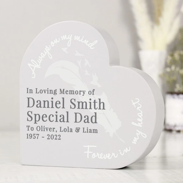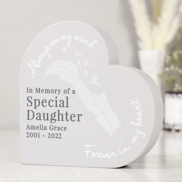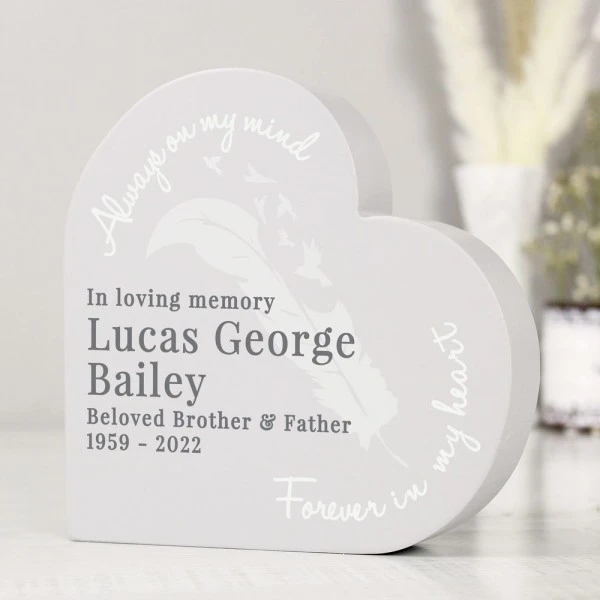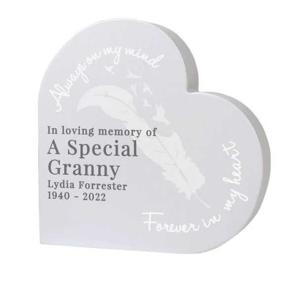 This beautiful feather free standing heart is a lovely way to commentate the life of a loved one.
