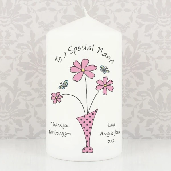 Personalise this Flower In Vase Candle with any occasion above the design up to 20 characters. You can also add a message to the left of the vase of 2 lines of up to 15 characters, and a slightly longer message on the right of the vase of up to 3 lines of 15 characters.