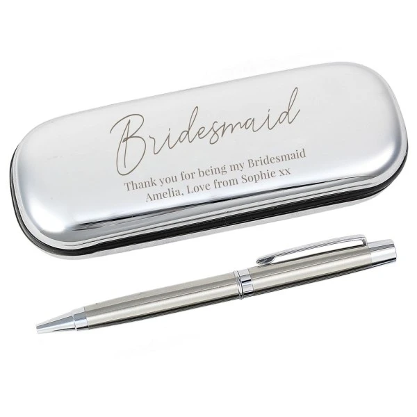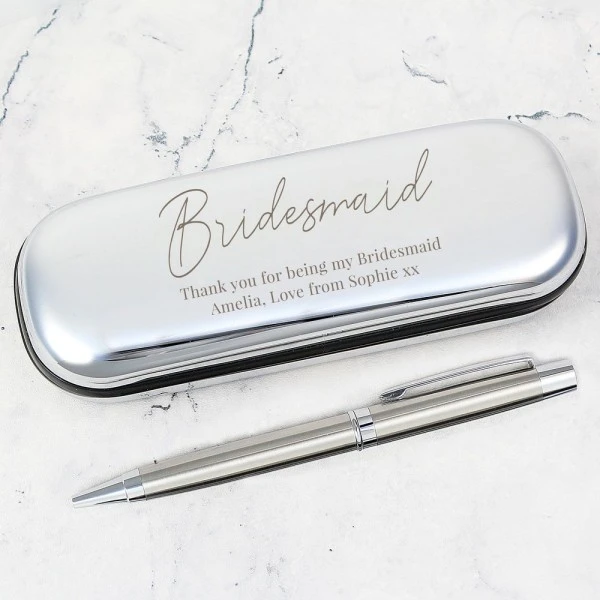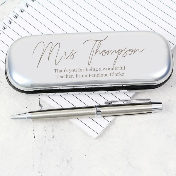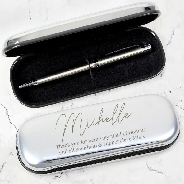 This chrome plated pen and box set includes a ball point pen and box which can be engraved with a message up to 3 lines, Line 1 (bigger text) can be personalised with up to 12 characters. Lines 2&3 can be personalised with 40 characters per line.