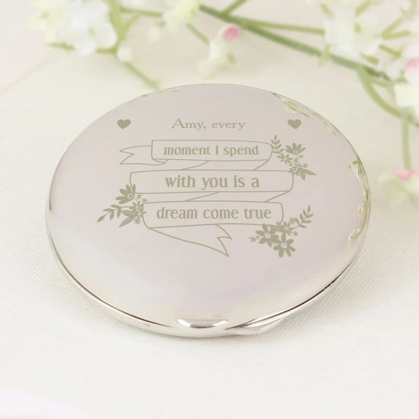 Personalise this garden bloom compact mirror with any message over 4 lines and up to 15 characters per line. Including spaces and punctuation.