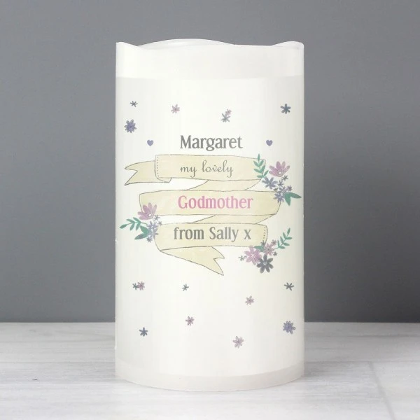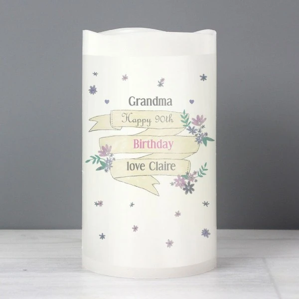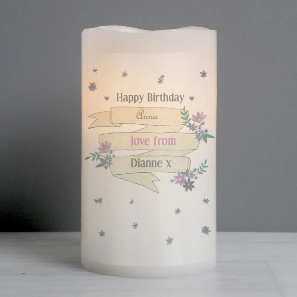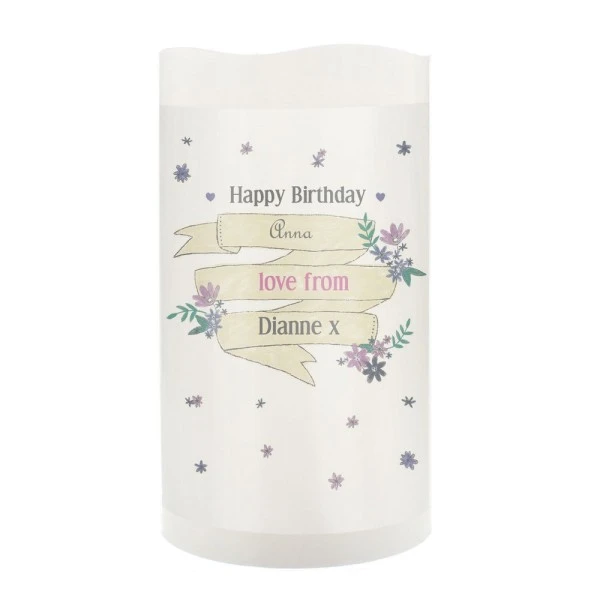 You can personalise the front of this Garden Bloom LED candle with 4 lines of text up to 15 characters per line. Lines 1, 3 & 4 are case sensitive and will appear as entered. Line 2, due to the font type used, please refrain from using all capitals.
