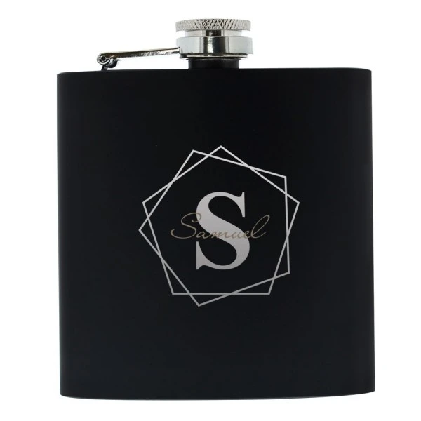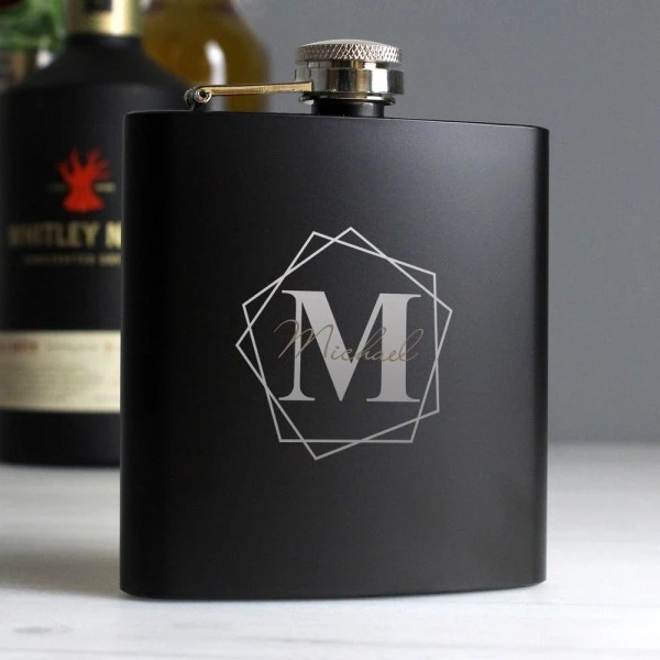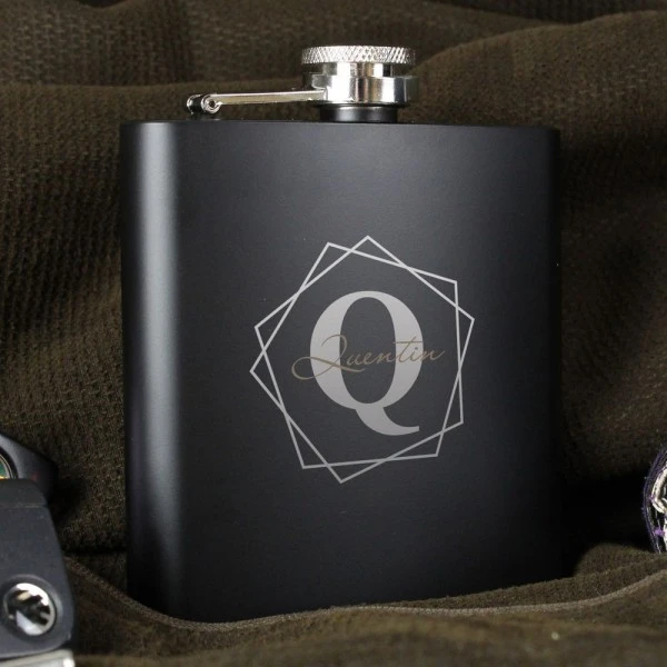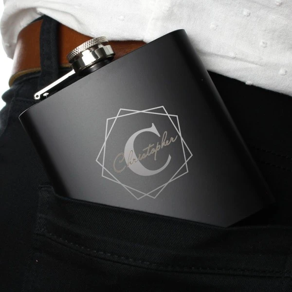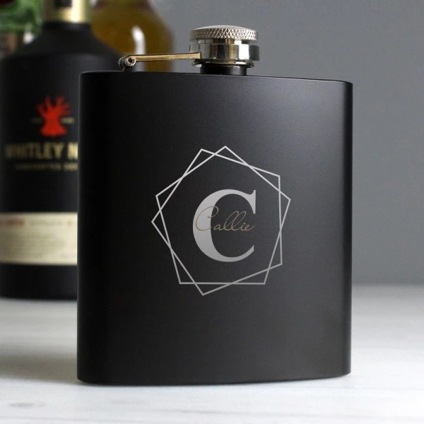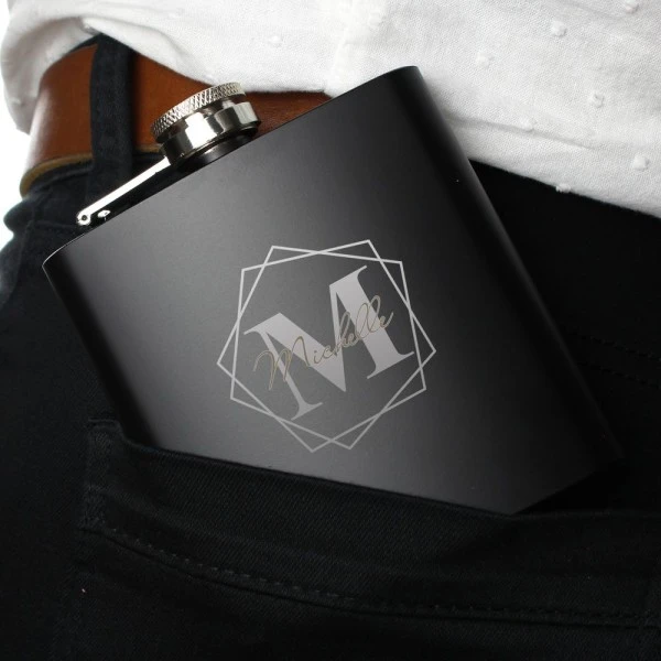 This stylish Personalised Geometric Initial Black Hip Flask is engraved with a two -tone effect, creating a stylish gift for all!