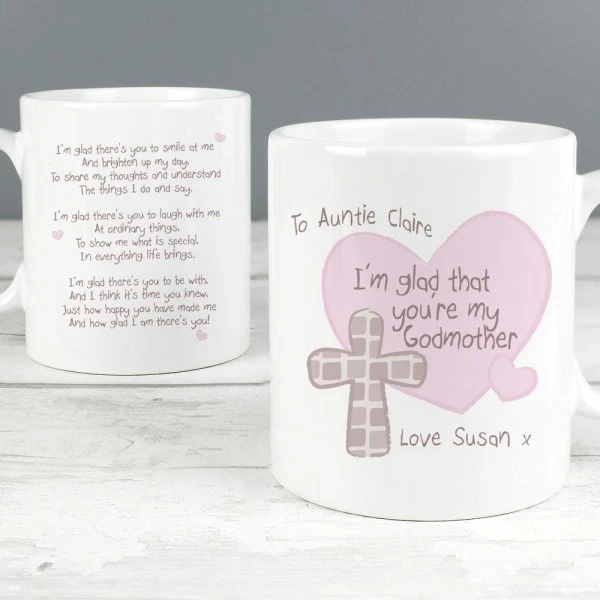 This lovely Godmother mug is the perfect way to say thank you to that very special person. Featuring an endearing verse on the back of the mug. The wording “I”m glad that you’re my Godmother” is standard on the front. The ‘Love and ‘To” are fixed text. Personalise with the names only, 20 characters per line.