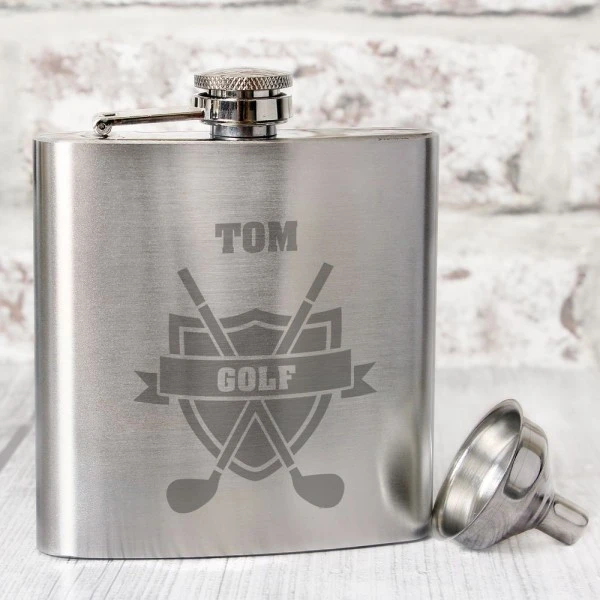 You can personalise this Hip Flask with a name up to 12 characters which will appear at the top. The word “GOLF” is fixed text.