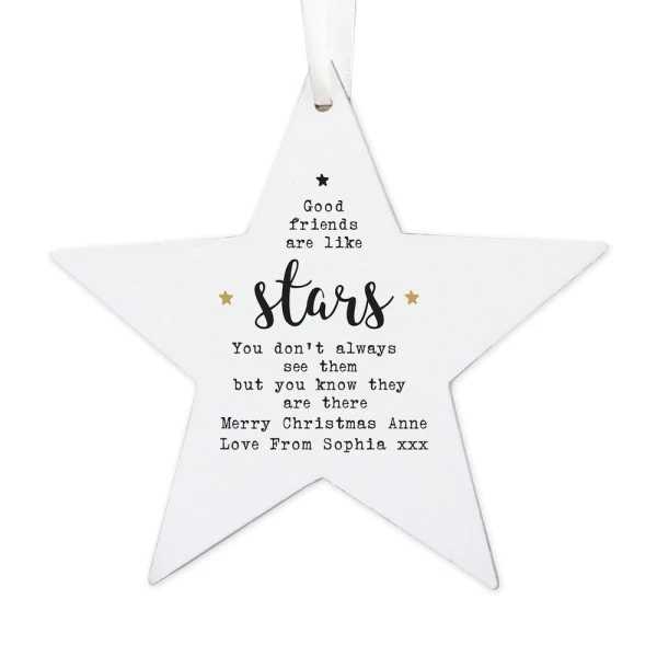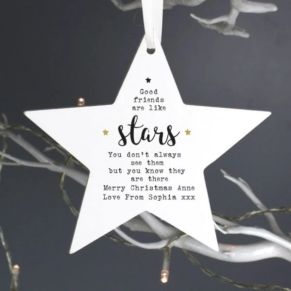 Personalise this Wooden Star Decoration with up to 2 lines with up to 20 characters available per line.