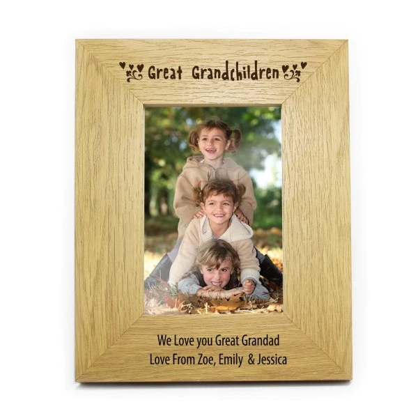 Personalise this Great Grandchildren 4×6 portrait wooden frame with a message over 2 lines of 30 characters per line. The words “Great Grandchildren” is fixed. All personalisation is case sensitive and will appear as entered.