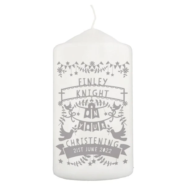 This Grey Paper Cut Pillar Candle is a gorgeous commemorative gift perfect for any religious occasion!
