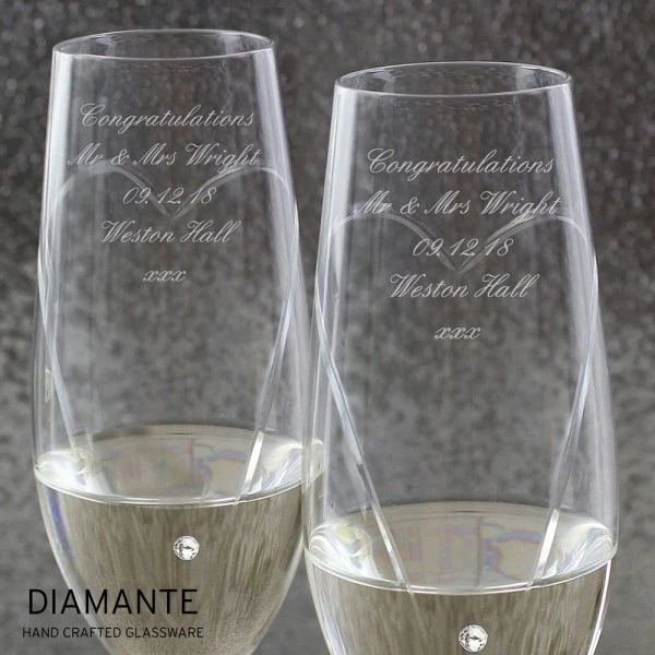 Personalise this set of Hand Cut Heart Flutes with the same message on each one over 5 lines, 17 characters max on the first 4 lines and 4 characters on the 5th line.