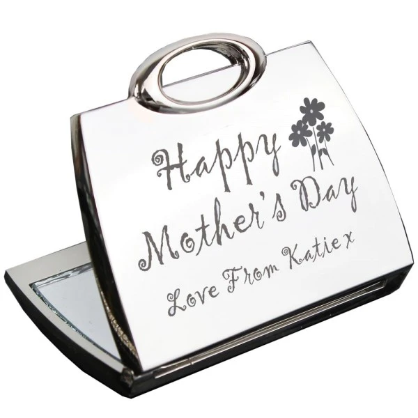 Silver coloured handbag compact mirror featuring a flowers motif can be personalised with any message up to 20 characters.