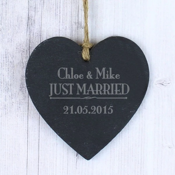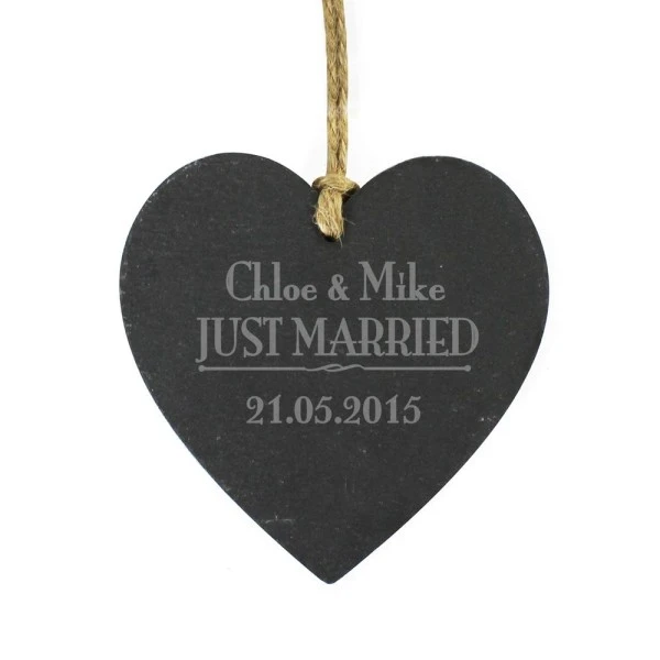 Personalise this Slate Hanging Heart for a newly married couple with 2 names including an “&” or a surname using up to 20 characters and one line of 10 characters for a date. The design features the fixed text “JUST MARRIED” The heart has a piece of natural, rustic string which enables this item to be hung up.