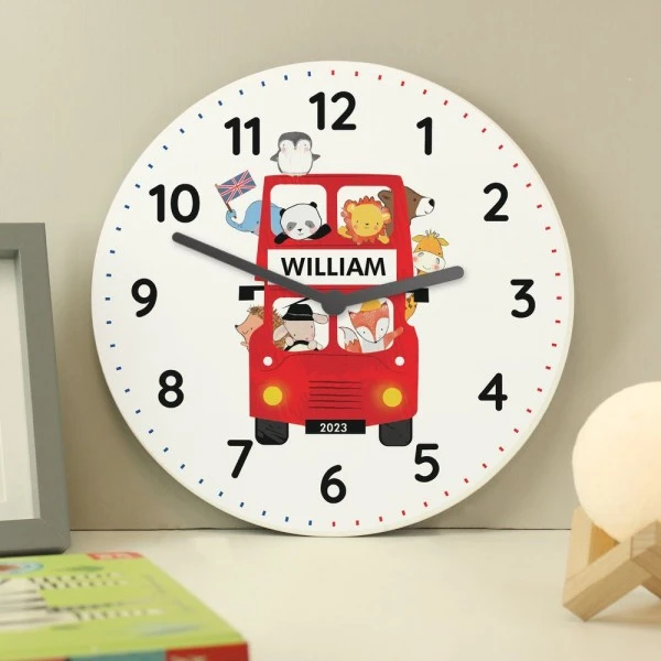 Our Personalised London Animal Bus Wooden Clock is the perfect addition to a nursery or to a bedroom.