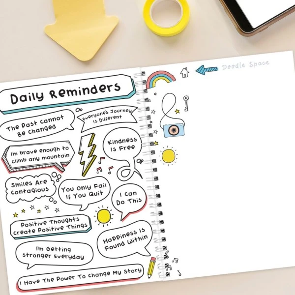 What will you find inside? A space to record your day, how you are feeling, things you are looking forward to, the best part of your day, things to remember, doodle spaces, negativity bins and positive quotes.