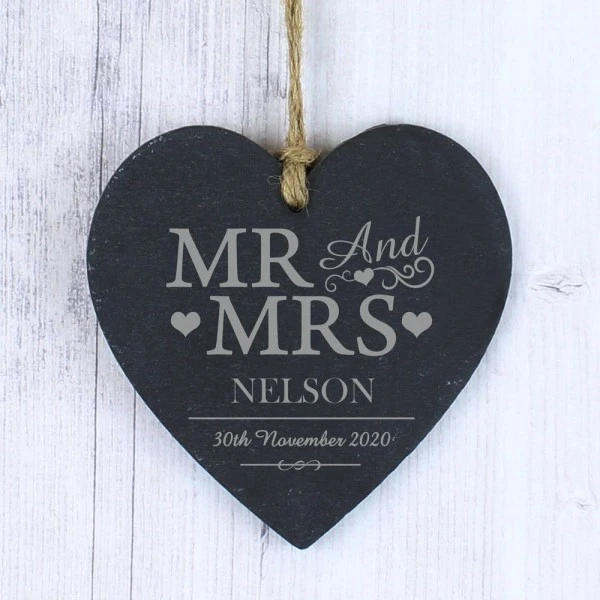 Personalise this Mr & Mrs Slate Heart with a couples surname up to 15 characters and date up to 20 characters.