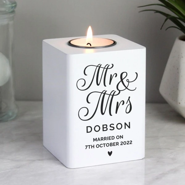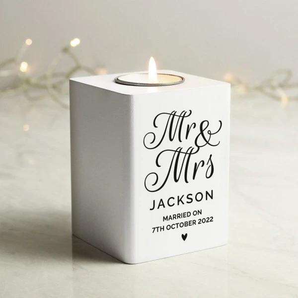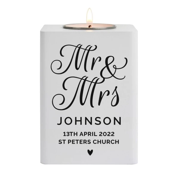 Personalise this white wooden tea light holder with a surname up to 12 characters long and 2 message lines with 20 characters available per line.