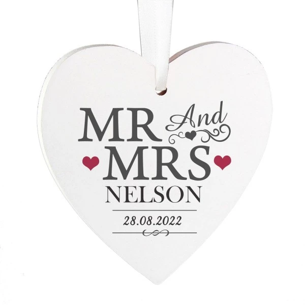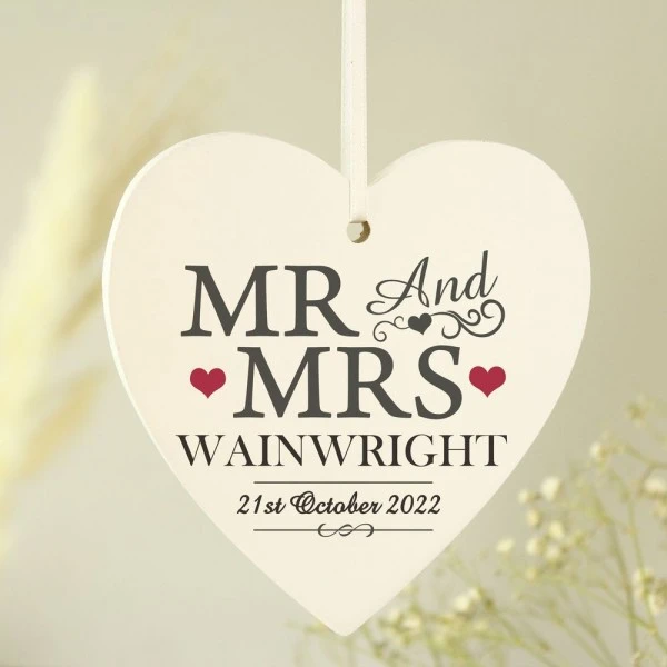 Personalise this Mr & Mrs Wooden Heart Decoration with a couples surname up to 15 characters and date up to 20 characters.