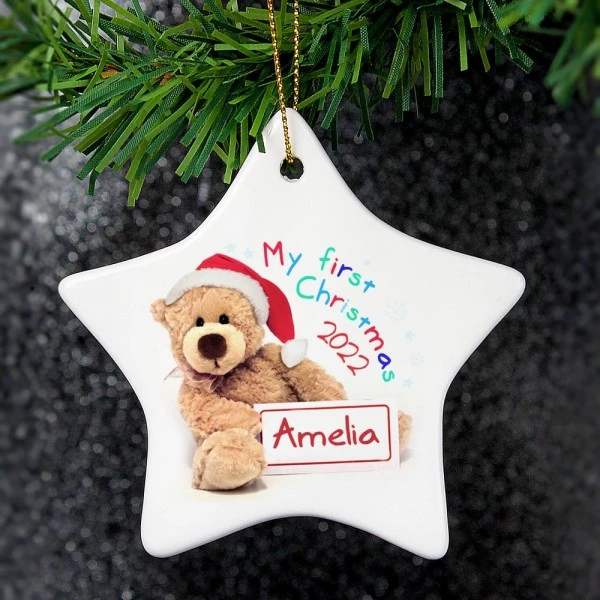 Personalise this festive, My First Christmas Teddy Ceramic Star Decoration with a name of up to 12 characters and a year.