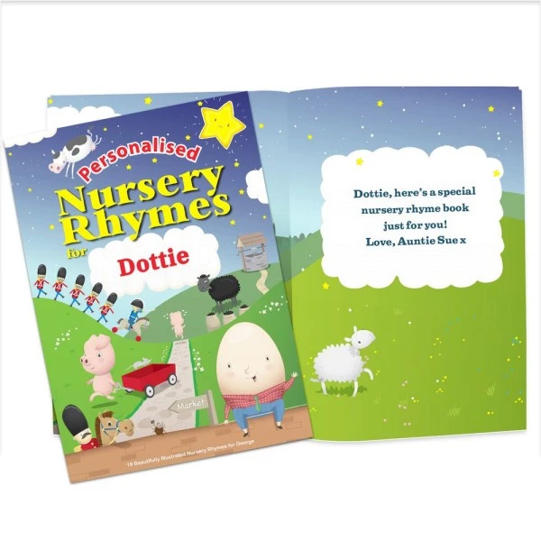 Our personalised Nursery Rhyme Book contains 19 beautifully illustrated popular nursery rhymes, each personalised with a child’s name, making it a perfect gift for a 1st Birthday, Christmas, New Borns and Christenings. The bright and colourful illustrations are sure to inspire their imaginations and provide hours of fun!