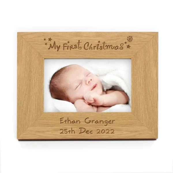 Personalise this My First Christmas 6×4 Wooden Frame with 2 lines of 30 characters below photo.
