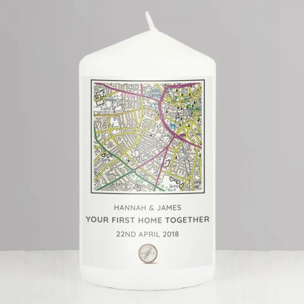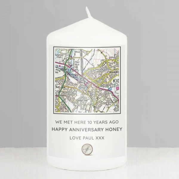 This Personalised Present Day Map Message Pillar Candle is a special way of celebrating any occasion.