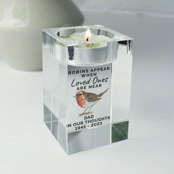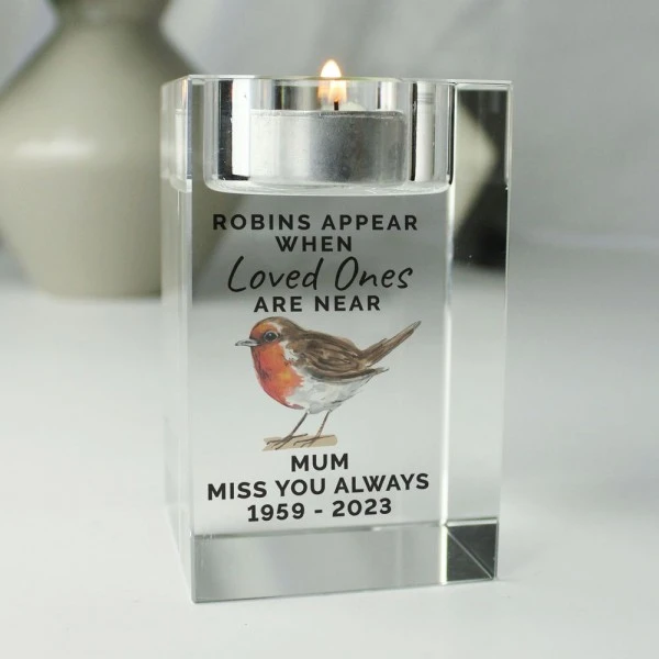 This Personalised Robin Memorial Glass Tealight Holder is a lovely way to remember a loved one.