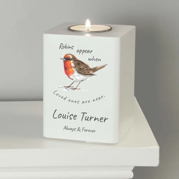 Light a candle for a loved one with this special personalised Robin memorial wooden tea -light holder.