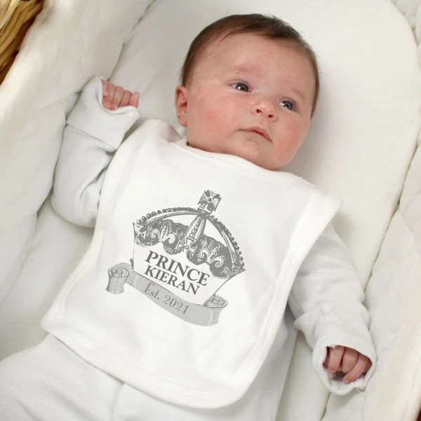 Personalise this Royal Crown Baby Bib over lines 1 & 2 of up to 12 characters per line. Line 3 up to 8 characters.