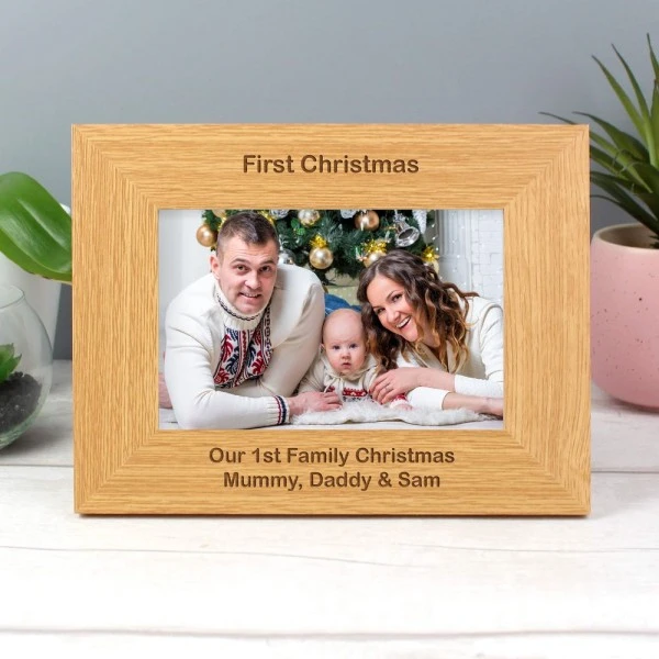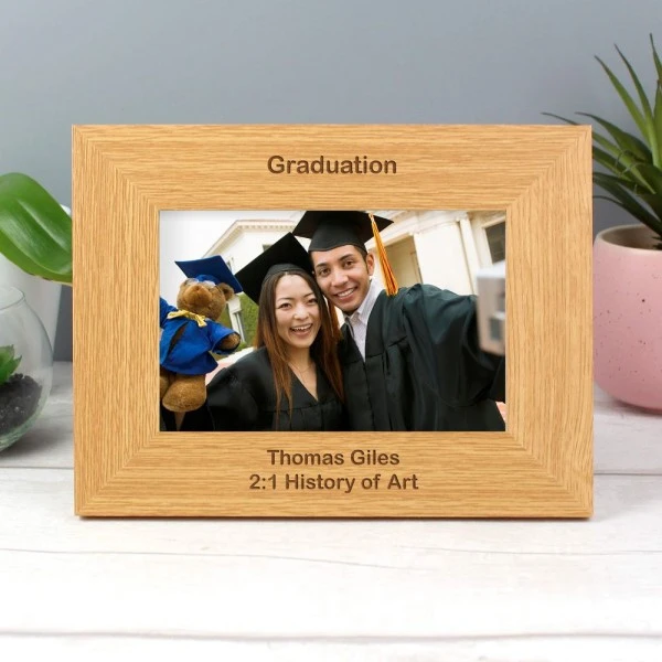 Personalise this 6×4 Oak Finish Decorative Frame with 1 line of a text above the photo of up to 20 characters and 2 lines of 25 characters below the photo.