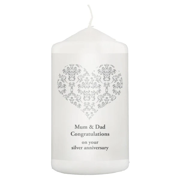 Personalise this silver damask heart candle over 4 lines up to 20 characters per line. The first two lines are in bold.