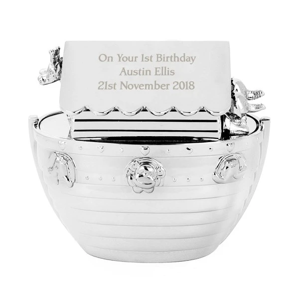 This silver finish Noah’s Ark Money Box can be personalised with any message over 3 lines and up to 20 characters per line.