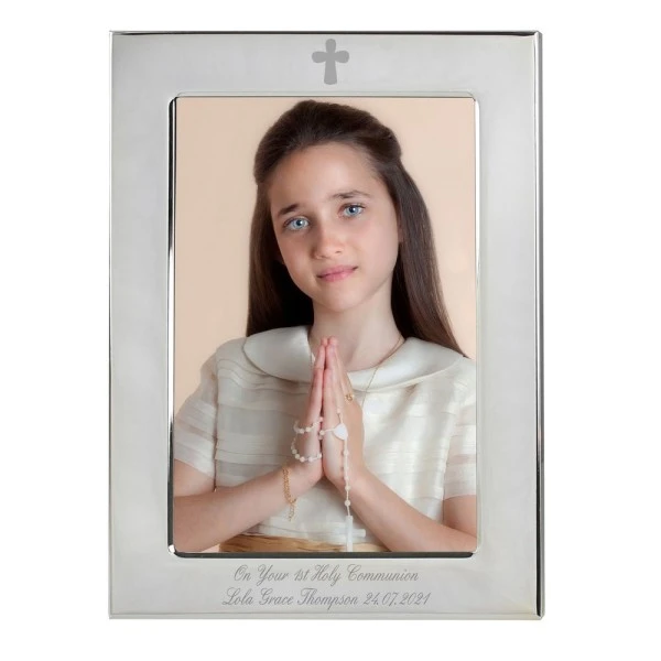An engraved silver frame featuring a cross motif can be personalised this with any message of your choice over 2 lines and up to 32 characters per line.