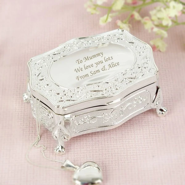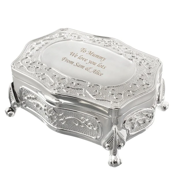 This silver finish trinket box can be personalised with any message over 3 lines and up to 20 characters per line on the lid.