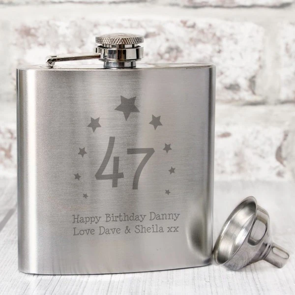 This 6oz Hip Flask is engraved with a star motif design, personalise with the age and a message over 2 lines and up to 25 characters per line.