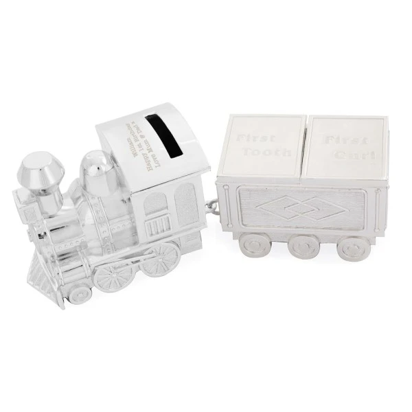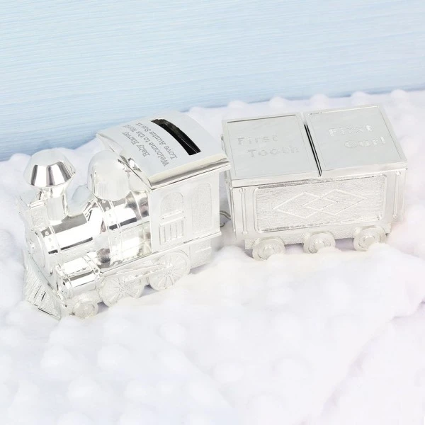 This silver plated train Money Box can be personalised on the train with any message over 3 lines and up to 20 characters per line just below the money slot.